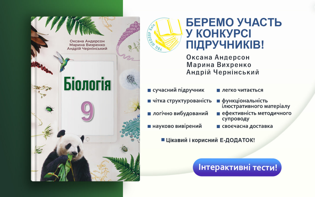 Повідомляємо, що підручник «Біологія. 9 клас» авторського колективу Андерсон О.А., Вихренко М.А., Чернінських А.О. бере участь у конкурсі підручників 2026 року.