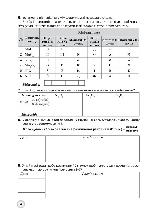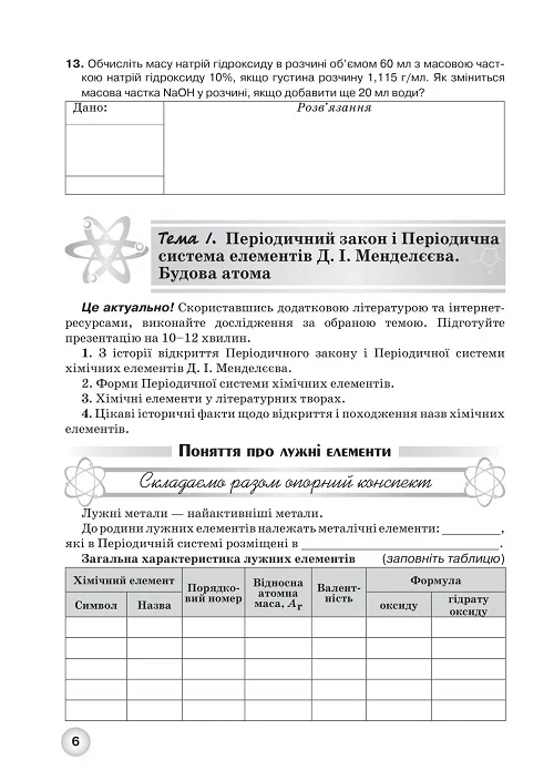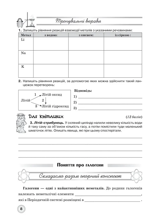 Робочий зошит з хімії учня 8 класу створено відповідно до програми з хімії для закладів загальної середньої освіти. Навчальний матеріал подається у вигляді опорних конспектів, таблиць та самостійних робіт.
